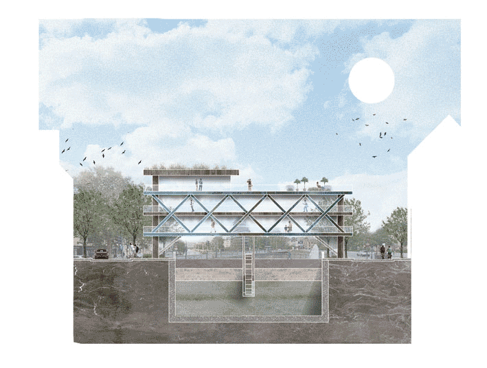 Ce projet vient implanter la halle d’expérimentation à proximité des ateliers de travail et de l’atelier maquette de l’École. Le bâti, situé sur le terrain du Lavoir, vient créer un lien entre la maison de la recherche, la banane et la cour. On constate également le lien créé avec le canal de par le décalage du bâtiment par rapport au lavoir, ainsi que le lien au jardin de la maison de la recherche, qui par sa végétation, appelle au calme et à la concentration.
